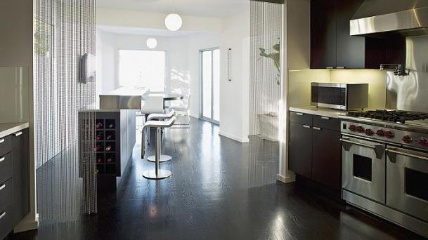 This apartment with nice shades of blue and a beautiful bathroom will help you to relax after work.